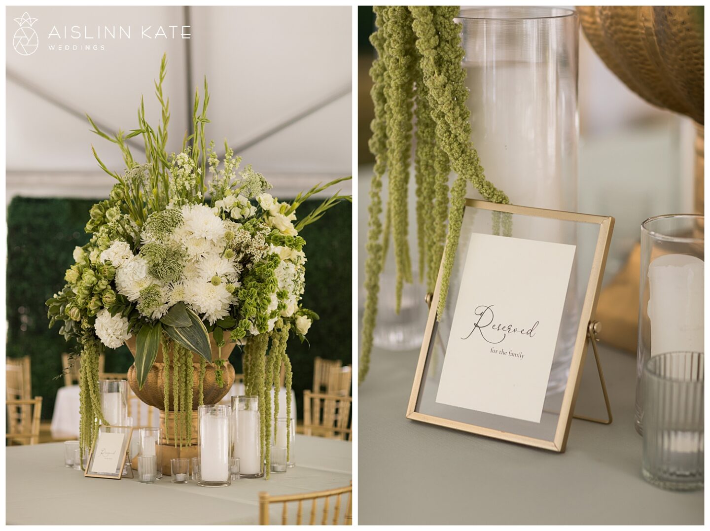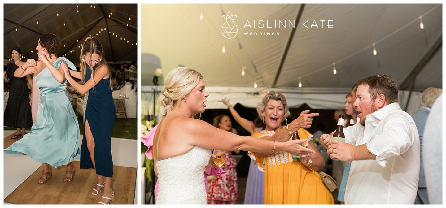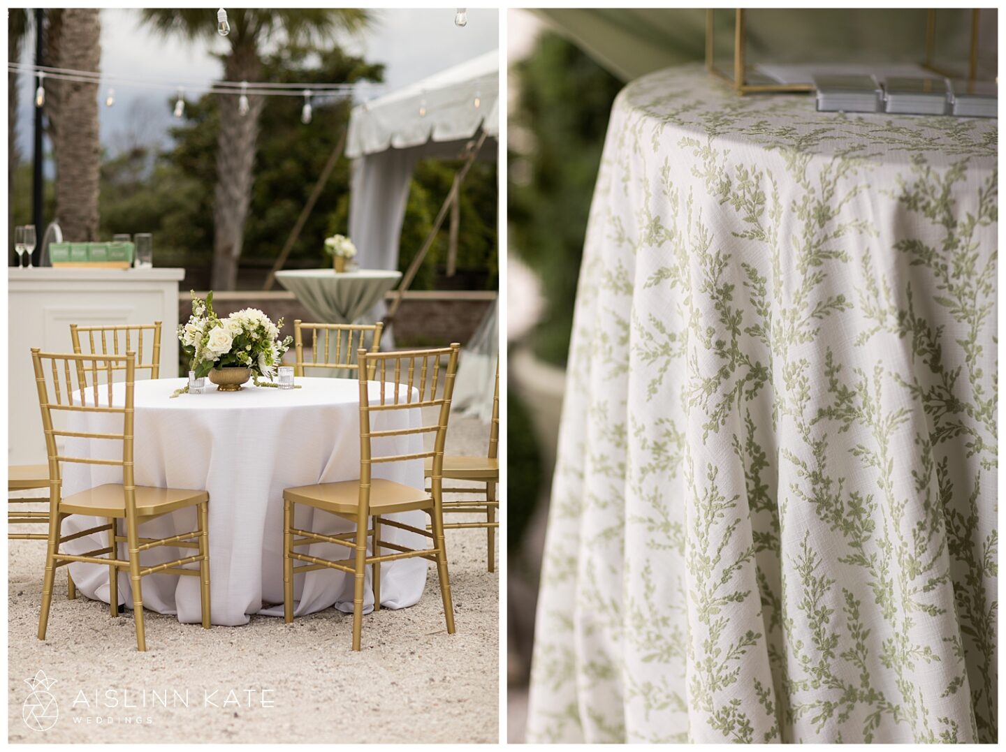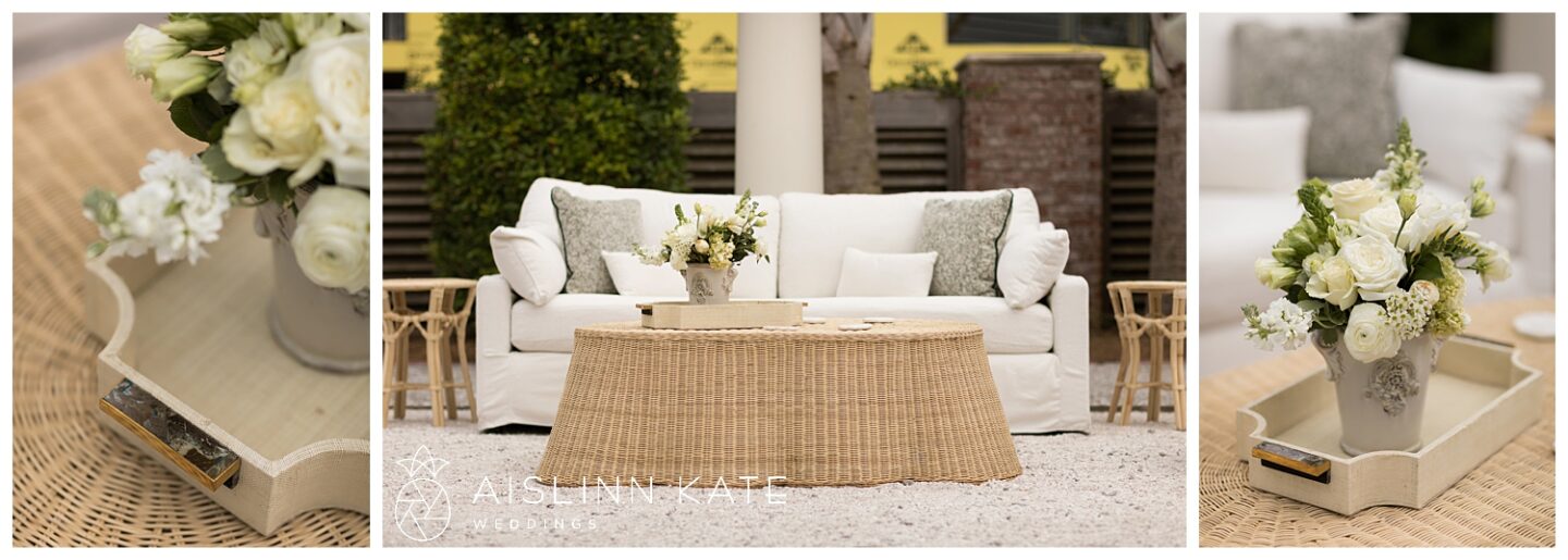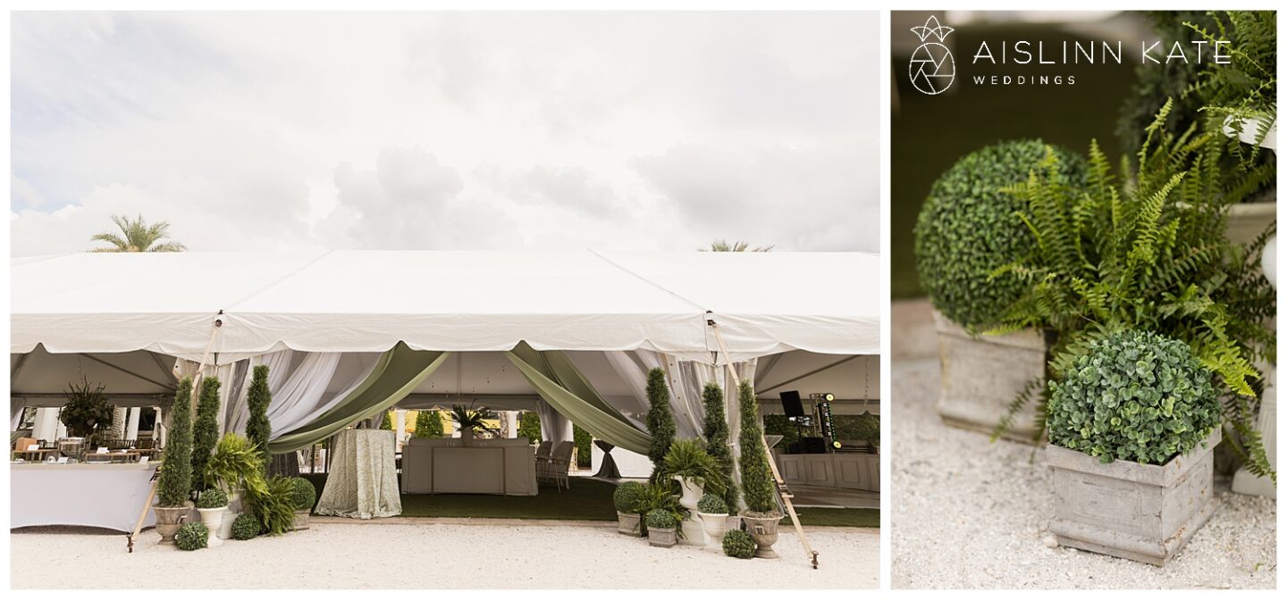 The ceremony and reception took full advantage of the stunning outdoor setting. Under the open-air tent, guests were welcomed to a celebration that felt both intimate and grand. Fresh floral arrangements in creamy whites and soft greens complemented the natural surroundings, while gold accents added a hint of timeless luxury. From the elegant table settings to the coastal-inspired décor, every element was thoughtfully curated to enhance the overall experience.