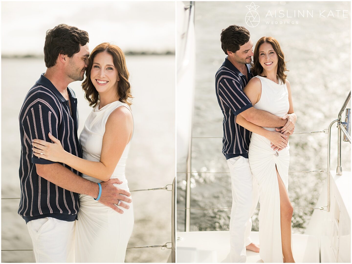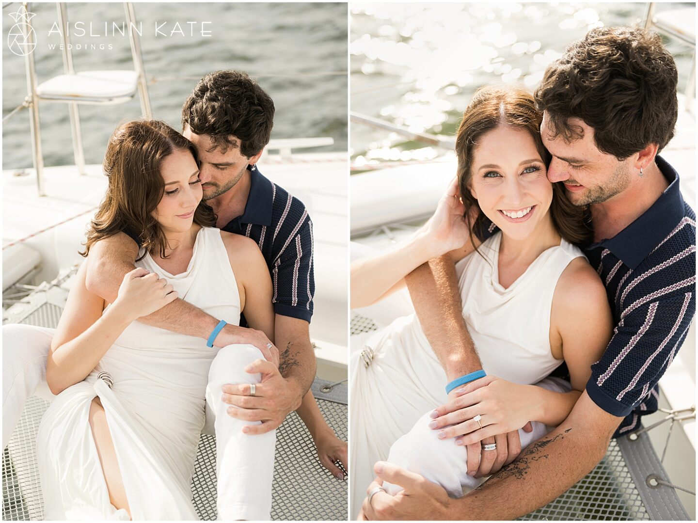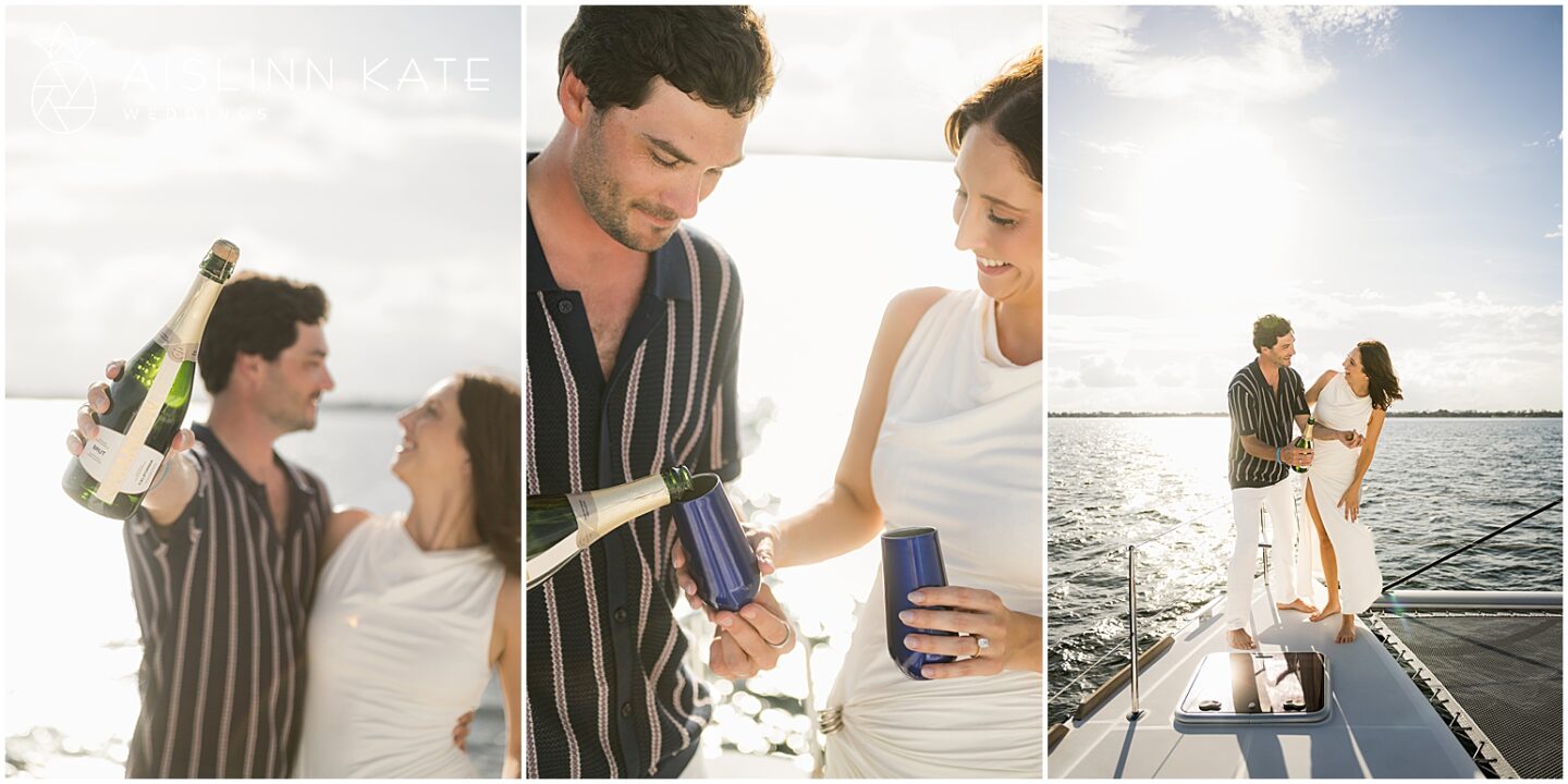 As the catamaran cruised past the coastline, the couple exchanged quiet moments wrapped in one another’s arms. Champagne was sipped, and laughter echoed across the waves. Each glance and touch held the weight of their shared past and the excitement of what’s to come. Meanwhile, the sun continued its descent, casting a soft pastel hue across the sky. At that point, the boat transformed into their private sanctuary—floating gently through the bay, as though time itself had slowed to honor the moment.
