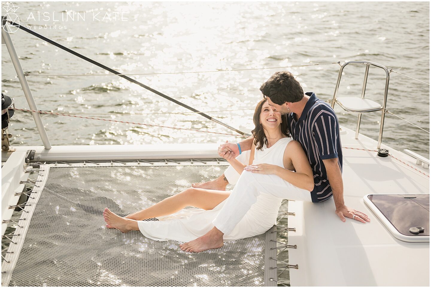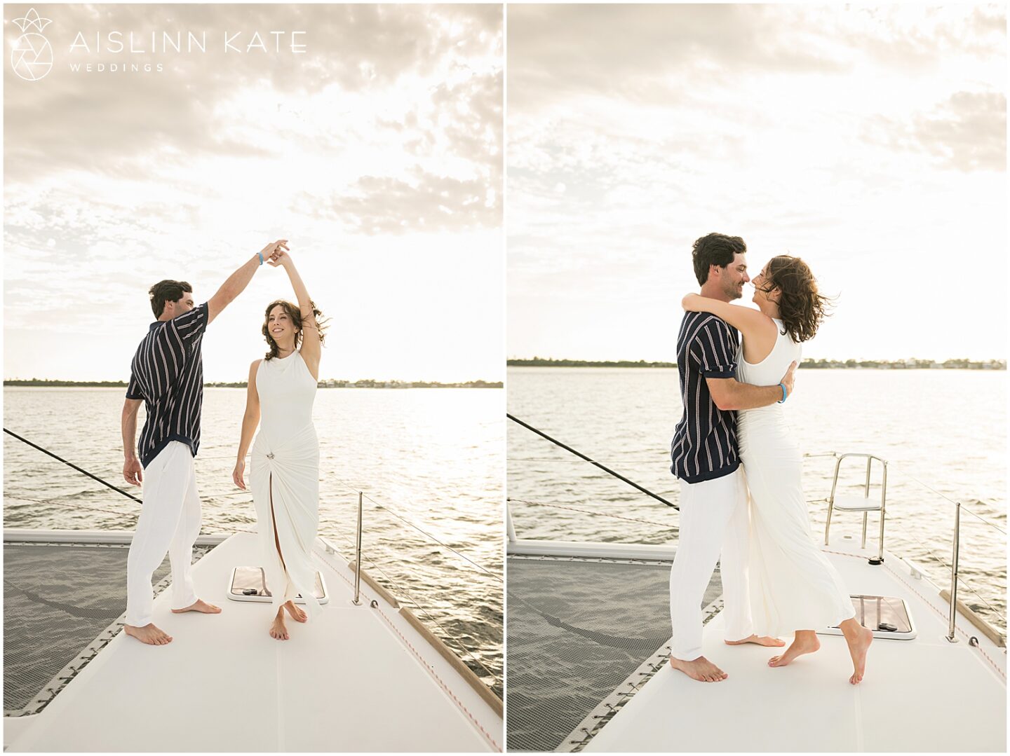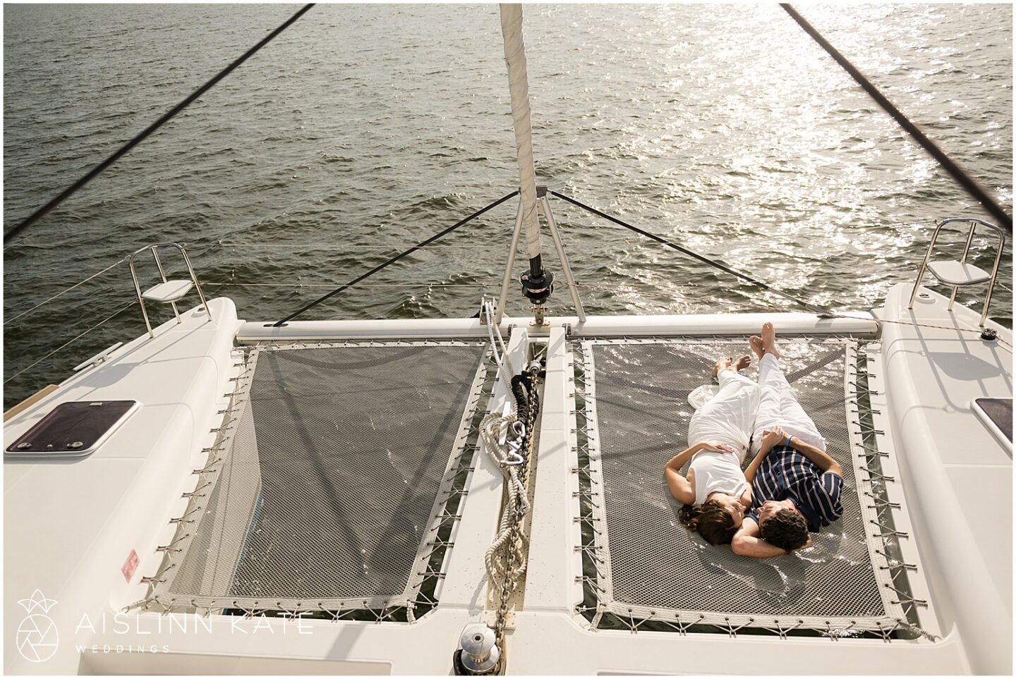As the catamaran cruised past the coastline, the couple exchanged quiet moments wrapped in one another’s arms. Champagne was sipped, and laughter echoed across the waves. Each glance and touch held the weight of their shared past and the excitement of what’s to come. Meanwhile, the sun continued its descent, casting a soft pastel hue across the sky. At that point, the boat transformed into their private sanctuary—floating gently through the bay, as though time itself had slowed to honor the moment.