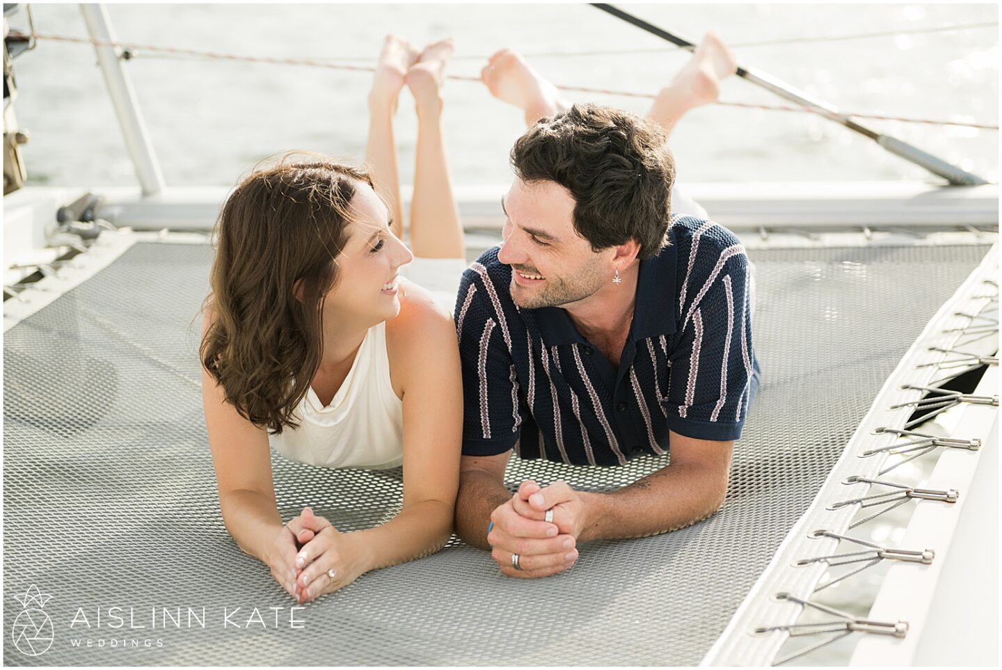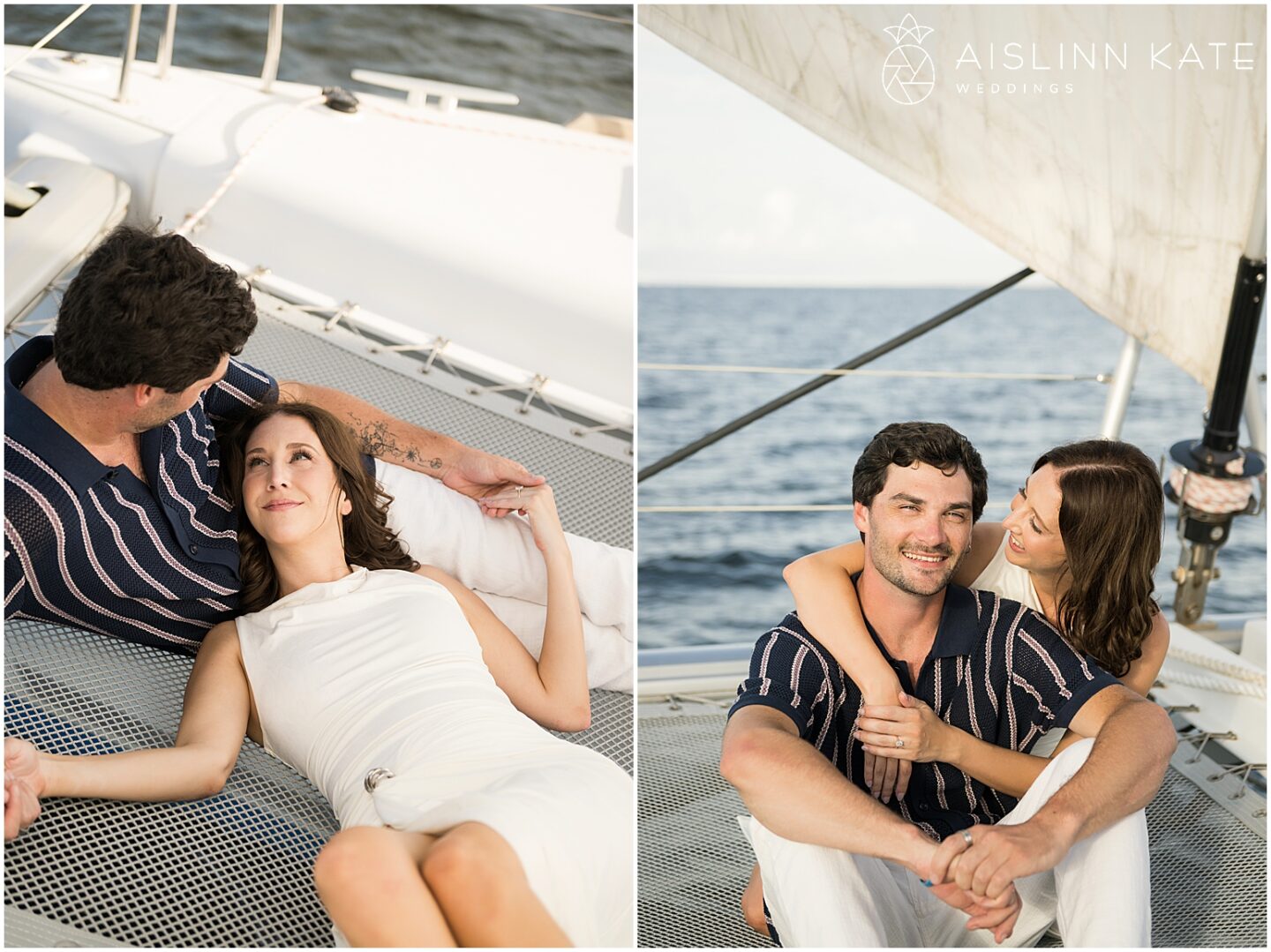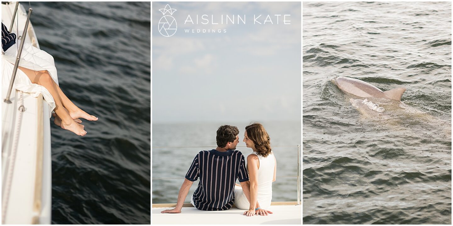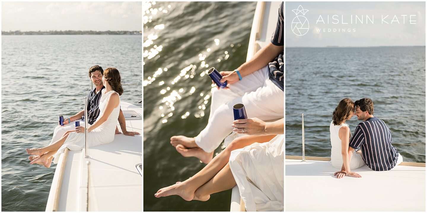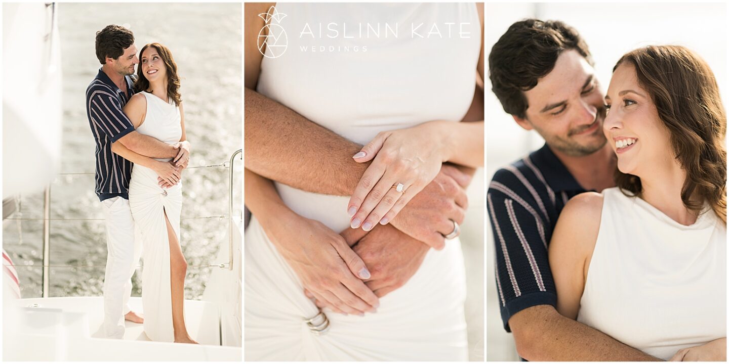 Naturally, because they met on a boat, celebrating their engagement on one felt like a full-circle moment. The scene was set aboard a sleek catamaran gliding across Pensacola Bay. The setting reflected the couple’s spirit: romantic, bold, and unapologetically genuine. As the boat cut across open water, the world seemed to fall away, giving them the freedom to simply exist together—to laugh, to flirt, and to be present without distraction.
