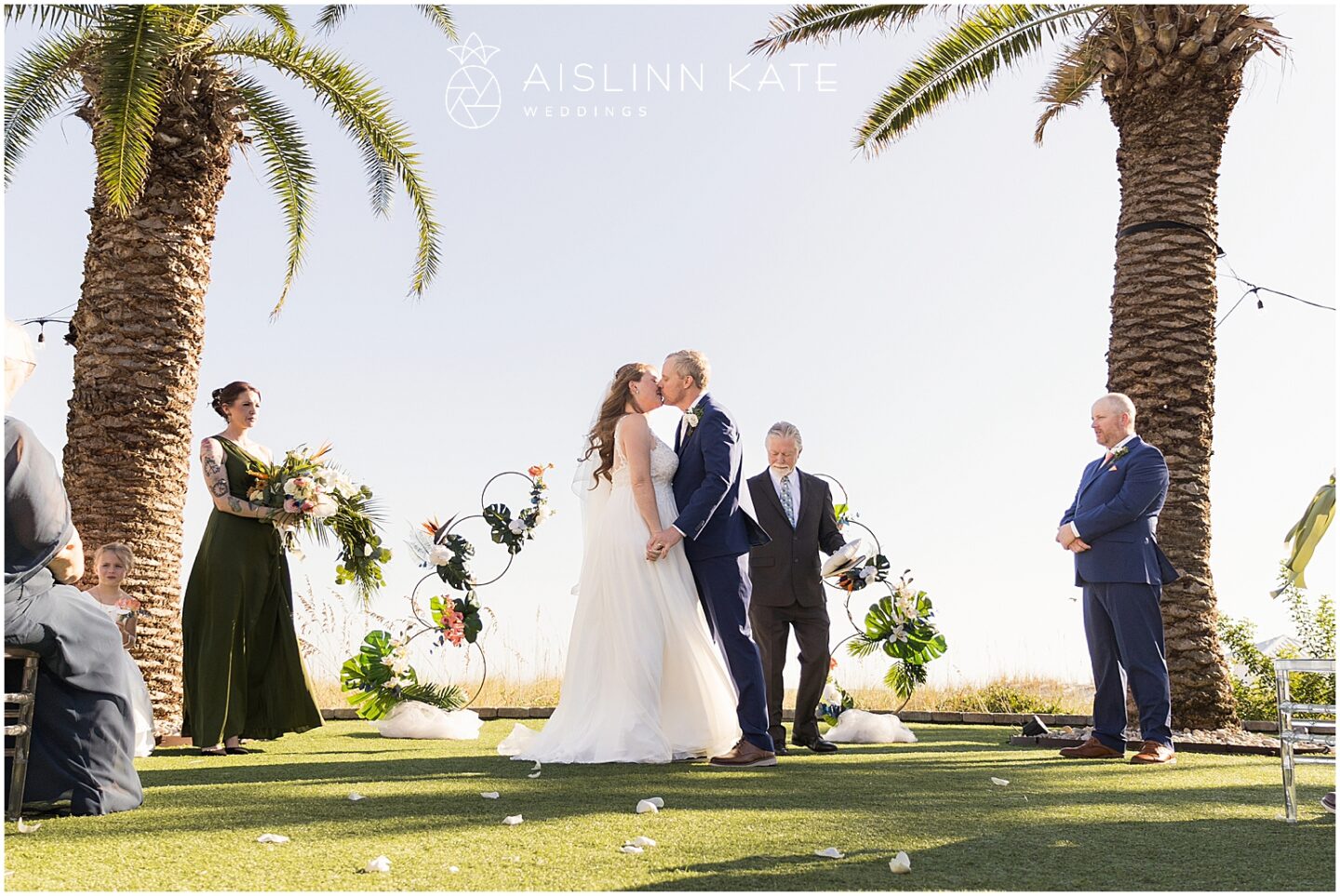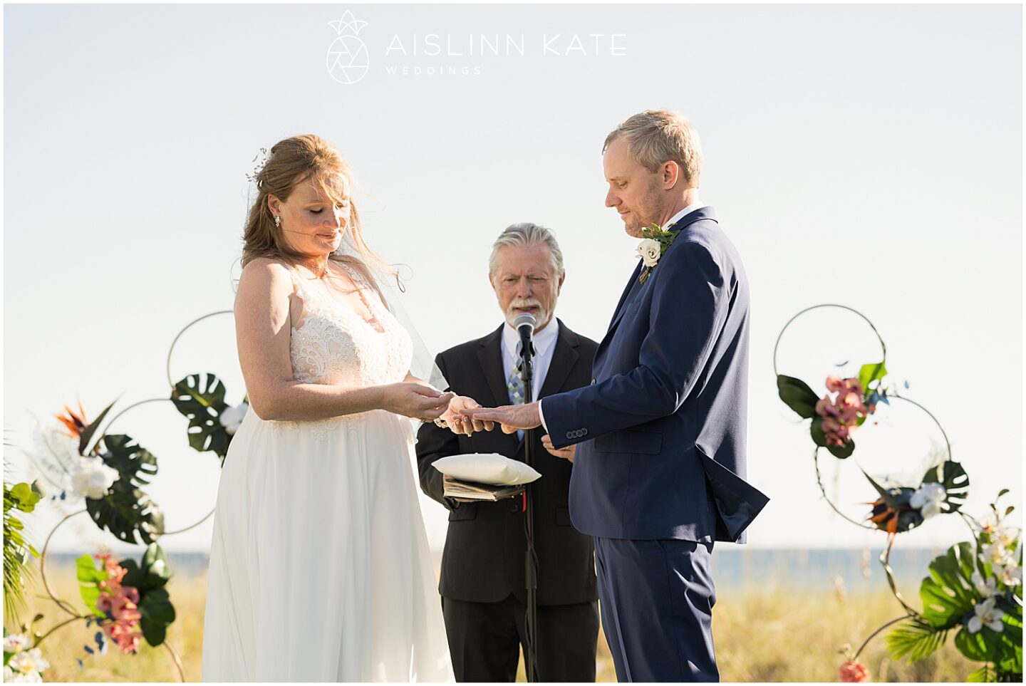 Guests gathered near the shoreline for their intimate and breezy beachside ceremony. Soft music played above the surf as Palmer watched Sara walk down the aisle. The moment felt surreal. Soon, vows turned into cheers and every detail matched their playful spirit.