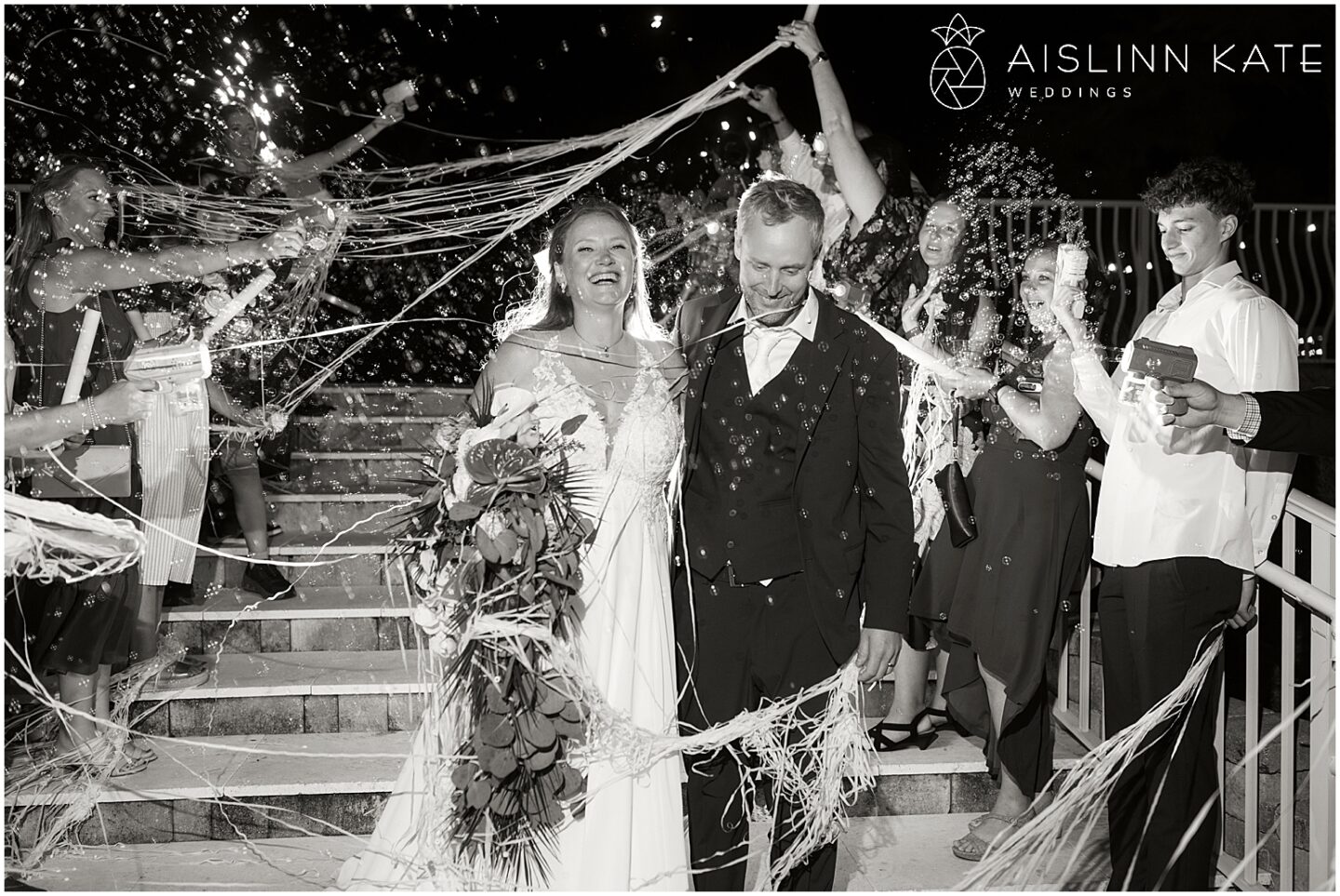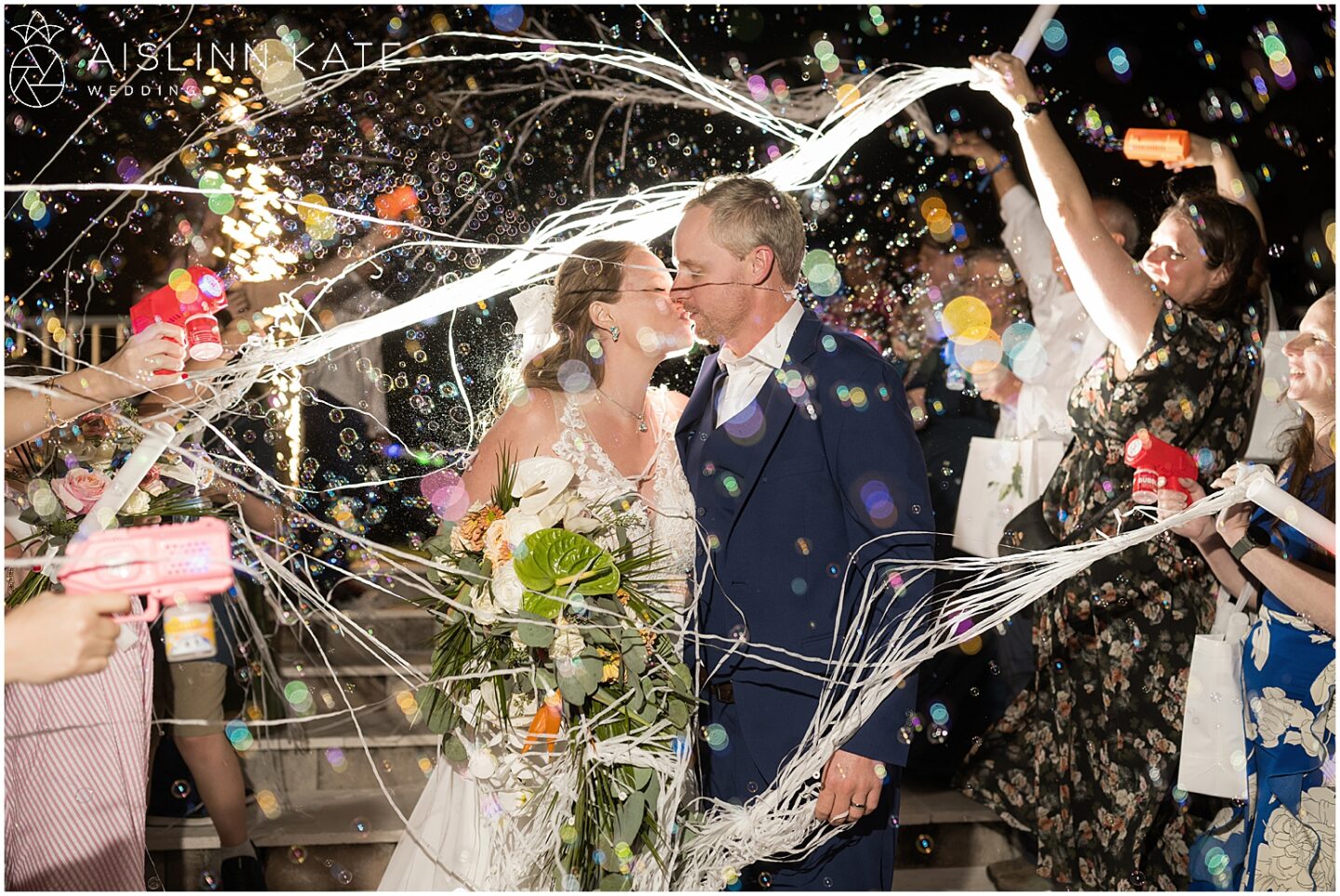 As the evening wound down, the celebration kept its joyful tone. The music softened and they shared hugs with family and friends. Soon, bubbles filled the air and streamers fluttered for the grand exit. Sara and Palmer stepped forward through the sparkling path. Their exit felt magical, light, and full of promise. It was the perfect closing moment for this Gulf Coast beachside wedding.