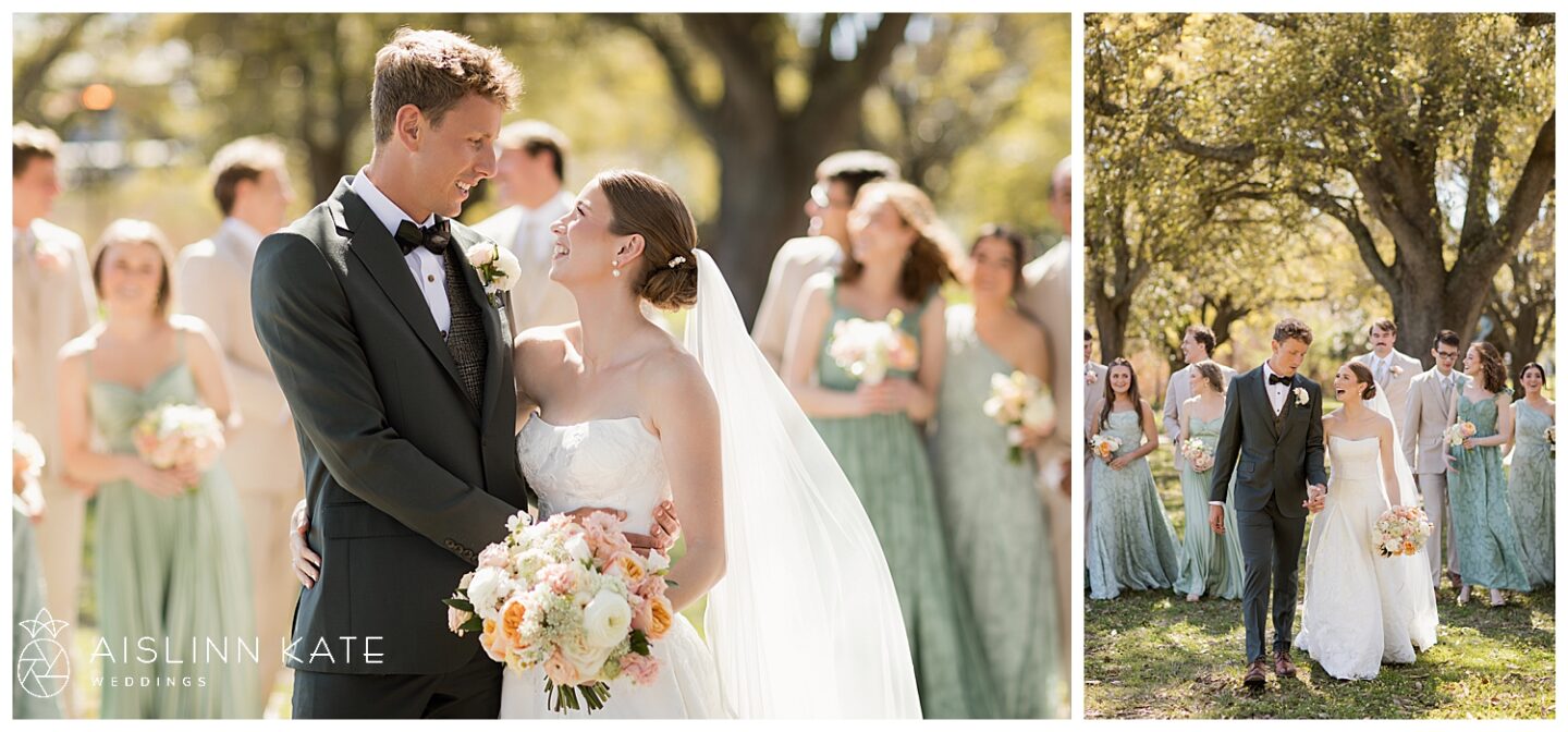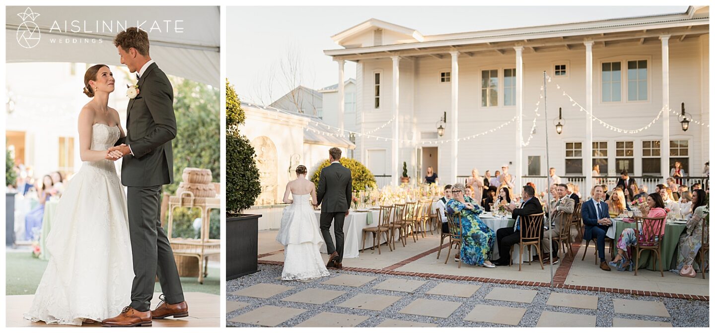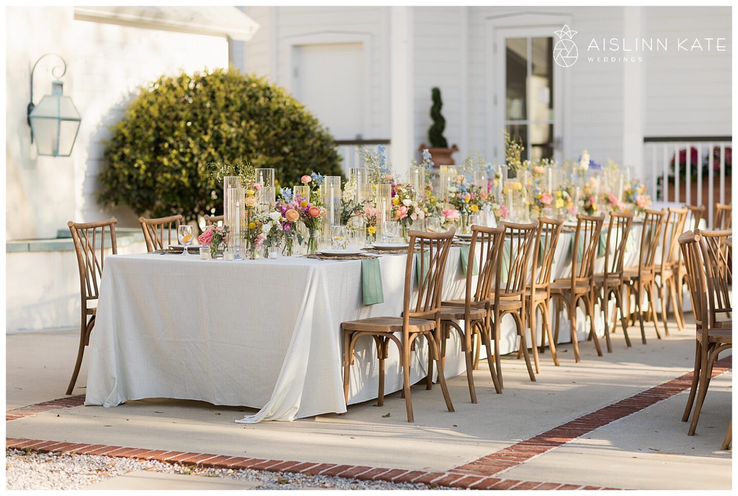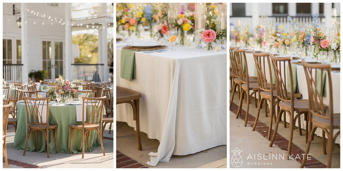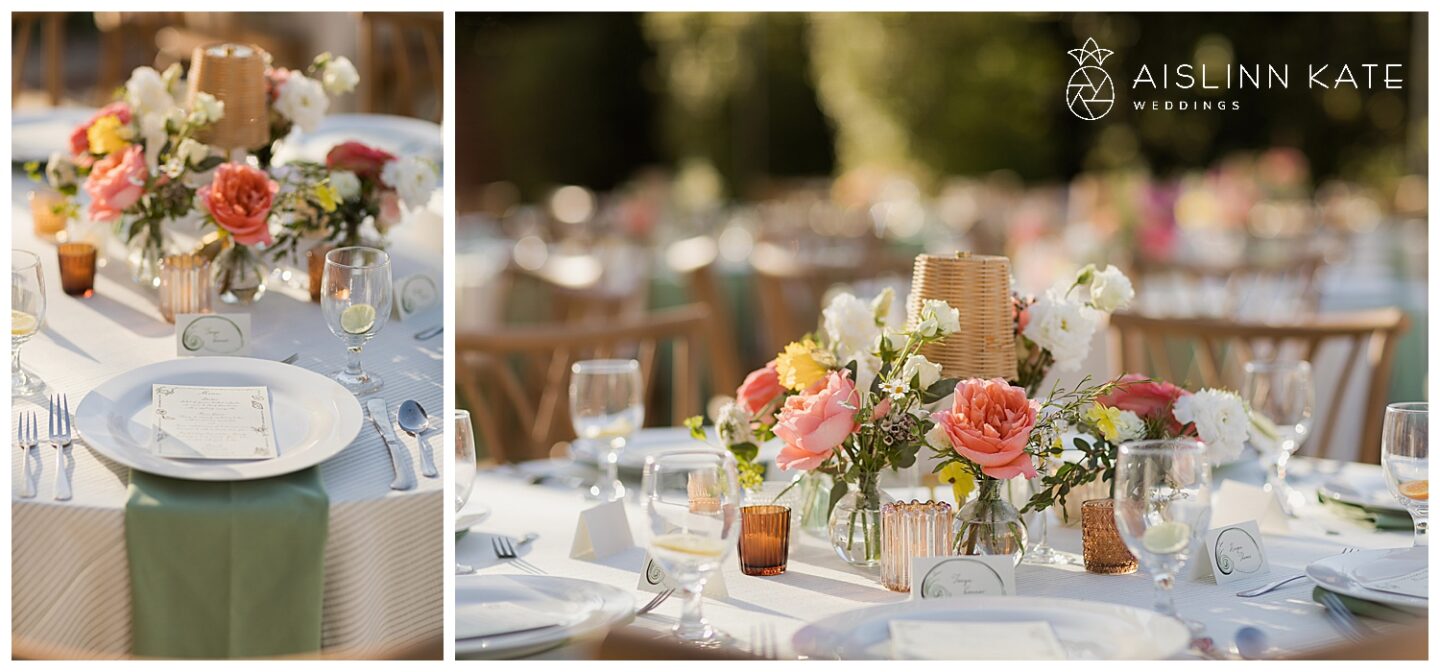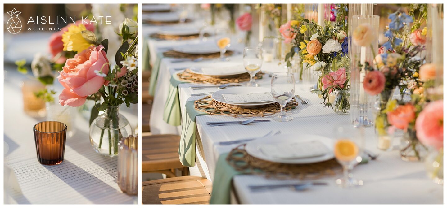 As the celebration continued, everyone gathered outdoors for an al fresco reception under golden spring sunshine. The weather couldn’t have been more perfect, allowing guests to dine, toast, and dance beneath the open sky. Long tables adorned with colorful florals and soft linens added to the garden-inspired aesthetic, while the golden hour light created a dreamy glow across the entire scene.